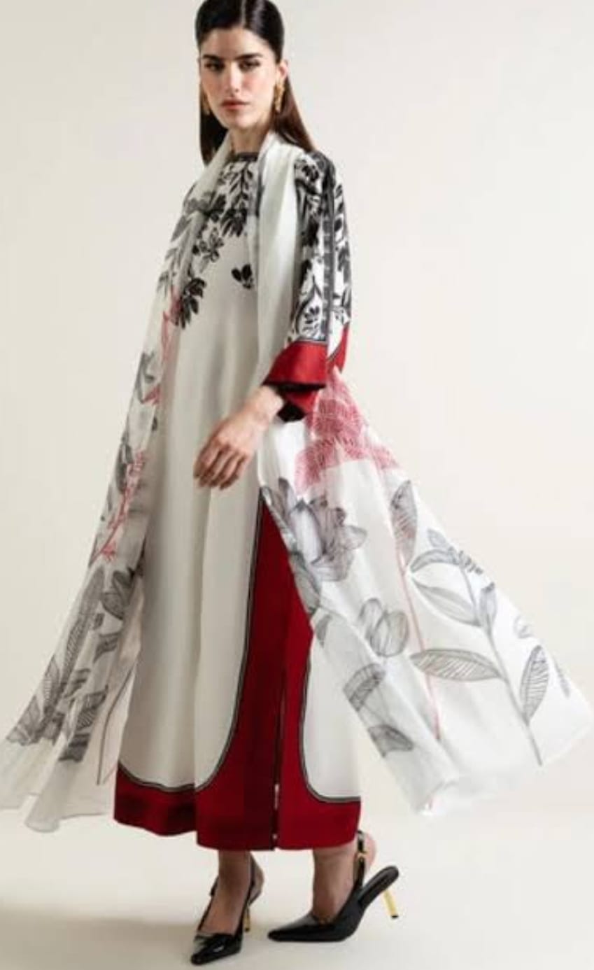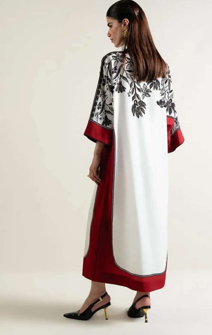 Shirt: Long straight cut silk shirt, ivory base with black floral print & red border detailing
